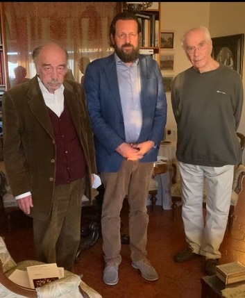Marcus Plested, centre, together with Christos Yannaras, right, and Demetrios Mavropoulos, Athens 2021.